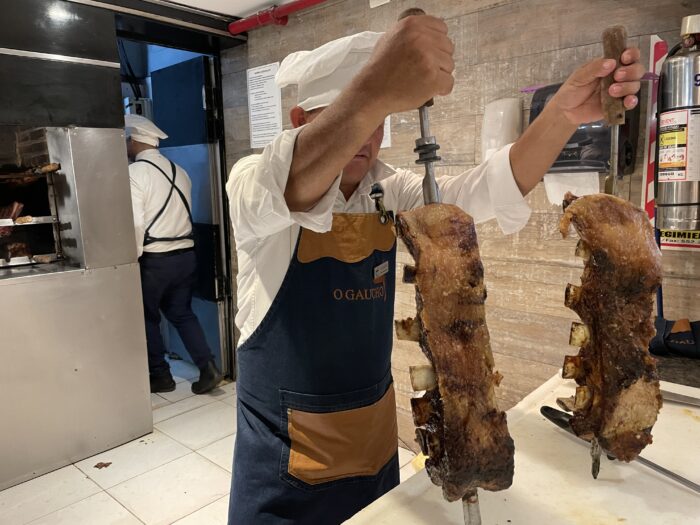 料理の中心は肉です。パラグアイはどうやら昔は肉の分類が大雑把で「骨付き」「骨なし」程度であり、ブラジルで好まれるピッカーニャ、アルゼンチンで好まれる「ビフェ・デ・チョッリソ」も無かったようです。現在は肉料理のレストランが増えて差別化が図られて来ています。また肉だけではなく、ハム・チーズのような前菜、各種サラダ、刺身、寿司、煮込み料理、パスタなど色々な料理が揃えられていて巨大食べ放題レストランとなっています。