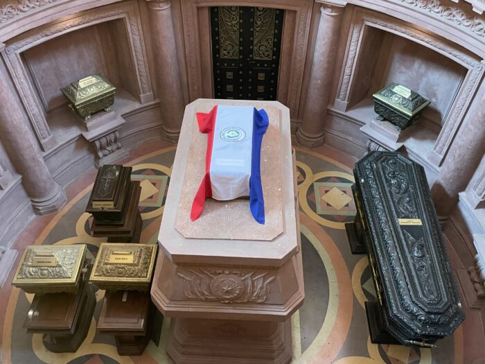 建物の入口には二人の衛兵が立っています。この二人の間を通って中に入る事が出来ます。丁度衛兵の交代が行われていました。所作が決められているようでキビキビとした動作で交代していました。中は確かに礼拝堂という作りで下に遺体が安置されています。現在、英雄霊廟に安置されている人物の遺骨は、以下の通りです。